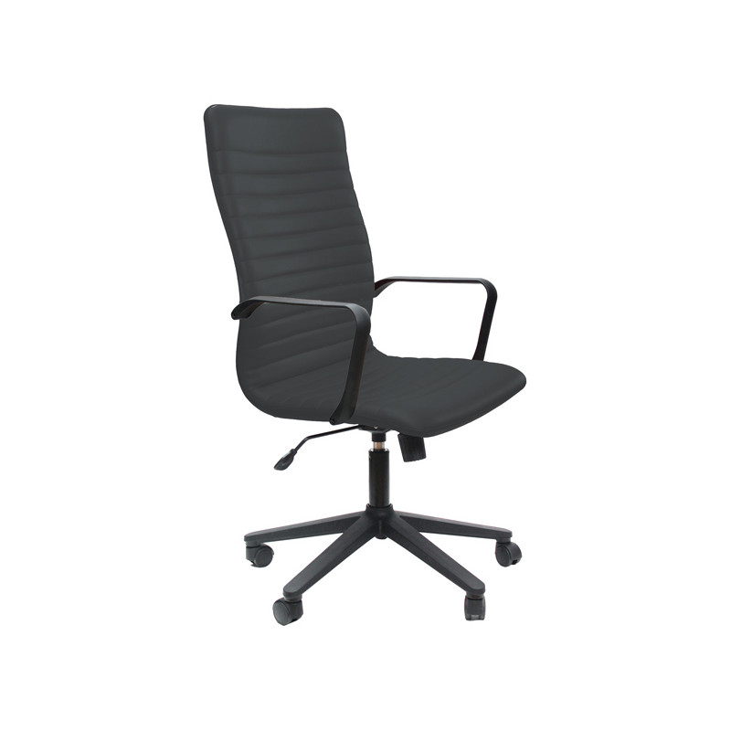 Poltrona direzionale girevole - sedile e schienale in multistrati di legno - elevazione a gas - meccanismo oscillante con blocchi. Rivestimento seduta in tessuto "PLUS - Eco Leather" idrorepellente, facile da pulire, senza flatati e flame retardant. Braccioli inclusi (non rimovibili). Alt.tot.: 108-117cm; Prof.tot.: 70cm; Alt.schienale: 66cm; Larg.schienale: 50cm; Larg.seduta: 50cm; Prof.Sedile: 48cm; Altezza sedile: 44-54cm.