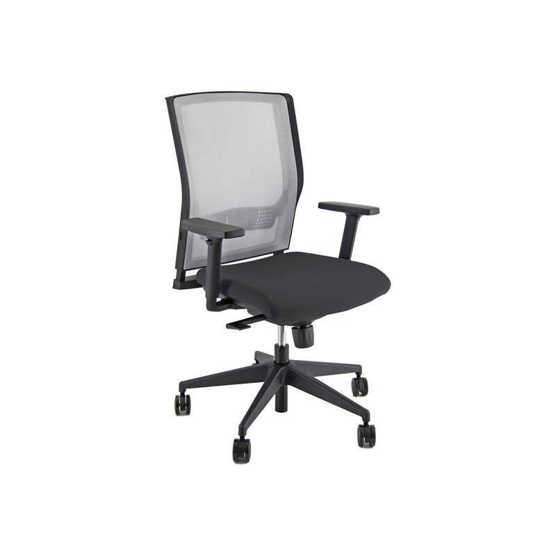 Poltrona semidirezionale H12 (adatta per uso intenso). Schienale alto in rete grigia con supporto lombare regolabile. Rivestimento seduta in acrilico 100%. Braccioli regolabili e base in nylon. Meccanismo syncro con 4 blocchi. Meccanismo anti shock, meccanismo a contatto permanente. Elevazione a gas.