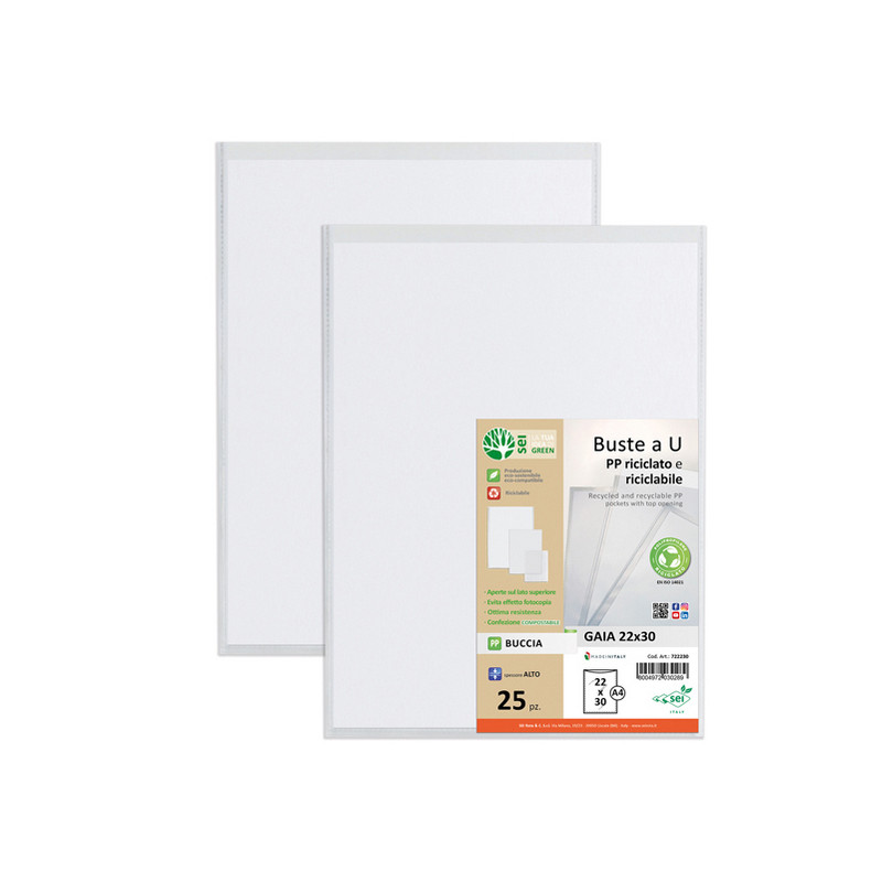 Buste in PP buccia, riciclato e riciclabile, aperte sul lato superiore. Alto spessore. Confezione compostabile al 100%. Ideali per archiviare qualsiasi tipo di documento (fotocopie, istruzioni, disegni, cartine) con un particolare pensiero alla sostenibilità.