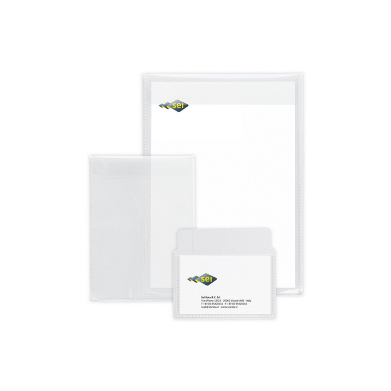 Buste in polipropilene liscio, alto spessore, con patella. Adatte a contenere tessere, documenti, fotocopie, istruzioni, carte di credito e biglietti da visita. Formato contenuto: 150x210mm.