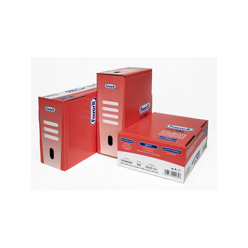 Buste in PP di alta qualità nella speciale scatola in cartone. Il contenitore, grazie al sistema di chiusura e ai fori di presa, si riutilizza come scatola archivio. Tipologia superior. Dimensioni della scatola: 27x35x13,5cm. Descrizione del contenuto 22x30cm - buccia. Confezione da 500. Made in Italy