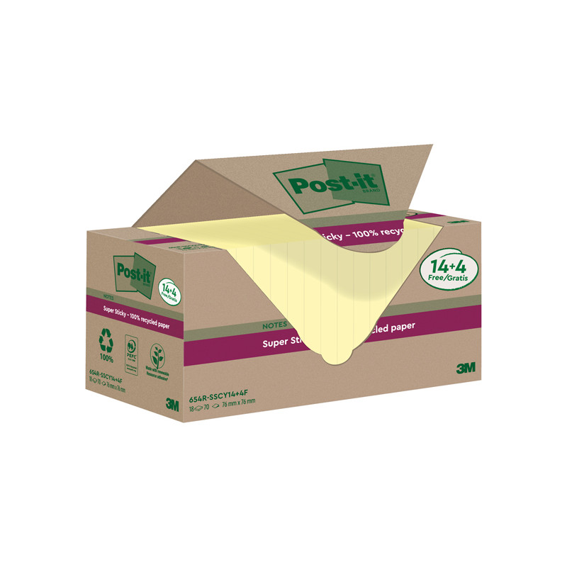 Foglietti Post-it®SuperSticky Green in carta riciclata al 100%. Doppia forza adesiva rispetto al trazizionale. Confezione in carta riciclata. Blocchetti da 70 fogli giallo Canary.