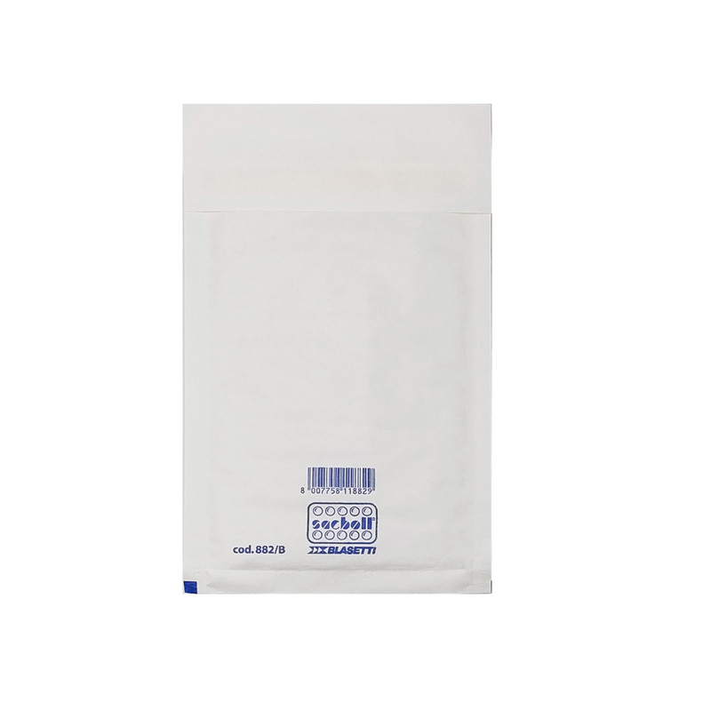 Sacco in carta bianca certificata FSC imbottito con pluriboll. Polietilene a bolle. Termosaldato su tre lati.Lembo autoadesivo protetto da Strip