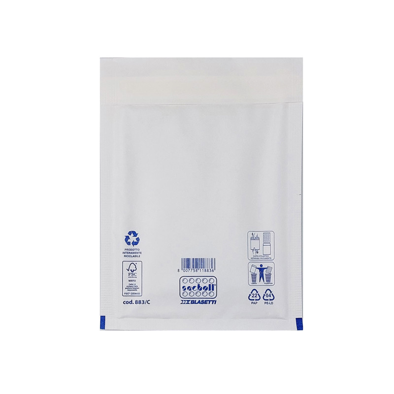 Sacco in carta bianca certificata FSC imbottito con pluriboll. Polietilene a bolle. Termosaldato su tre lati.Lembo autoadesivo protetto da Strip