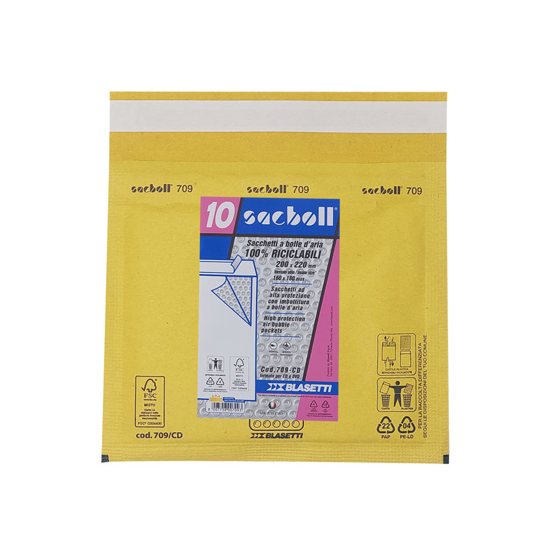 Sacco in carta avana certificata FSC imbottito con pluriboll. Polietilene a bolle. Termosaldato su tre lati.Lembo autoadesivo protetto da Strip