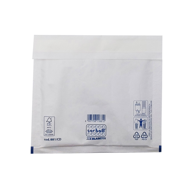 Sacco in carta bianca certificata FSC imbottito con pluriboll. Polietilene a bolle. Termosaldato su tre lati.Lembo autoadesivo protetto da Strip
