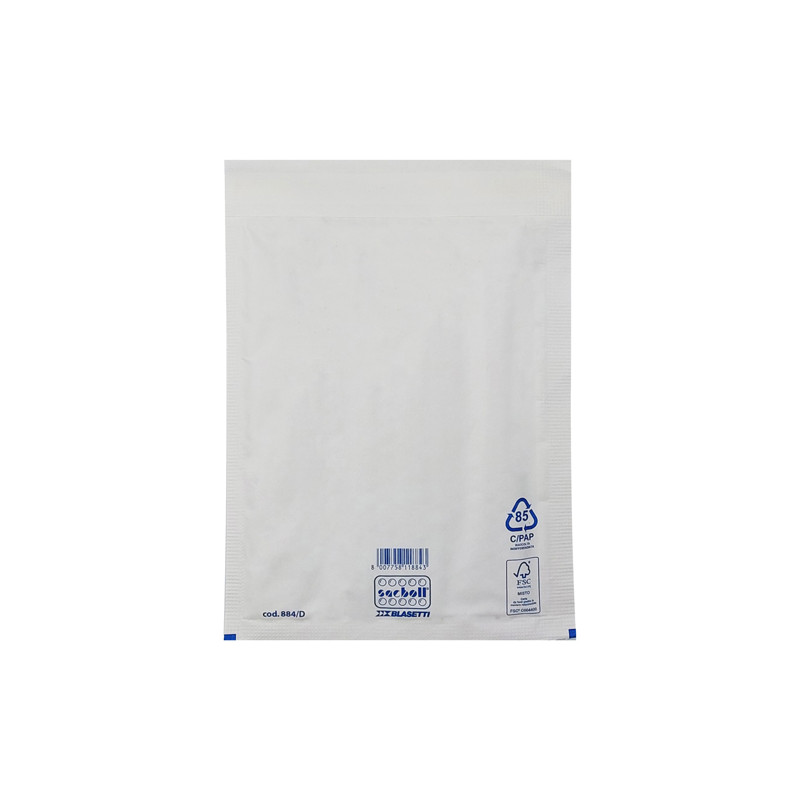 Sacco in carta bianca certificata FSC imbottito con pluriboll. Polietilene a bolle. Termosaldato su tre lati.Lembo autoadesivo protetto da Strip