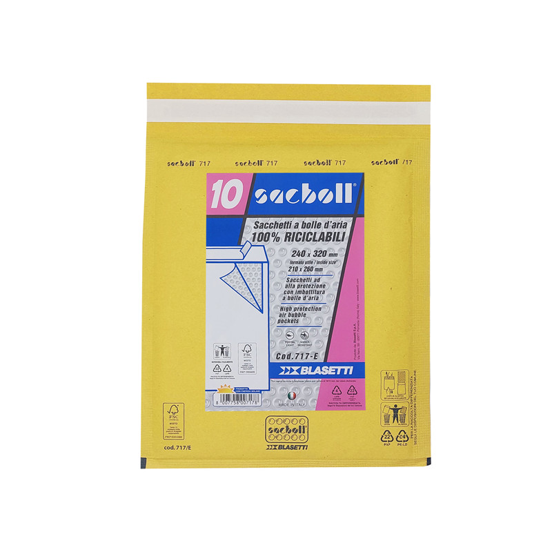 Sacco in carta avana certificata FSC imbottito con pluriboll. Polietilene a bolle. Termosaldato su tre lati.Lembo autoadesivo protetto da Strip