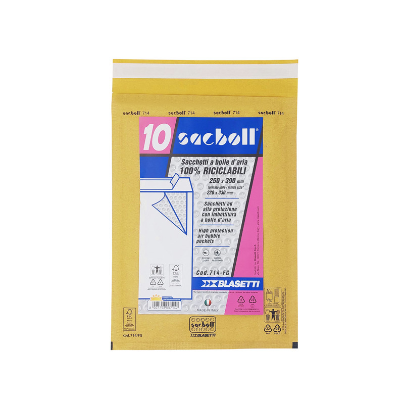 Sacco in carta avana certificata FSC imbottito con pluriboll. Polietilene a bolle. Termosaldato su tre lati.Lembo autoadesivo protetto da Strip