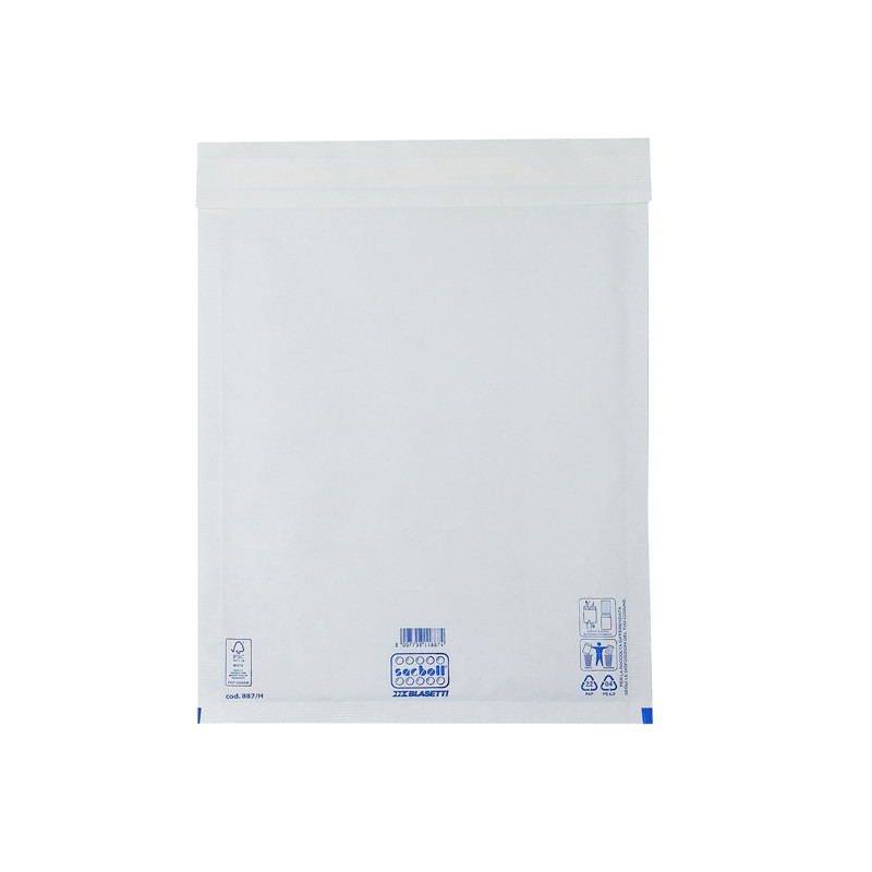 Sacco in carta bianca certificata FSC imbottito con pluriboll. Polietilene a bolle. Termosaldato su tre lati.Lembo autoadesivo protetto da Strip