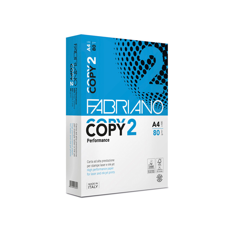 La carta per fotocopie Copy 2 Fabriano di colore bianco di alta qualità che offre elevate prestazioni sia con tecnologia Laser, Fax, Fotocopiatrici, Getto d'inchiostro. 100% pura cellulosa sbiancata con processi ecologici certificata ECF (Elemental Chlorine Free). Dotata di una garanzia di lunga durata (ISO 9706). Ottimo punto di bianco. Certificazione: ECF (Elemental Chlorine Free) Acid free Garanzia di lunga durata (ISO 9706). Ideale per fotocopie e stampe laser o inkjet.