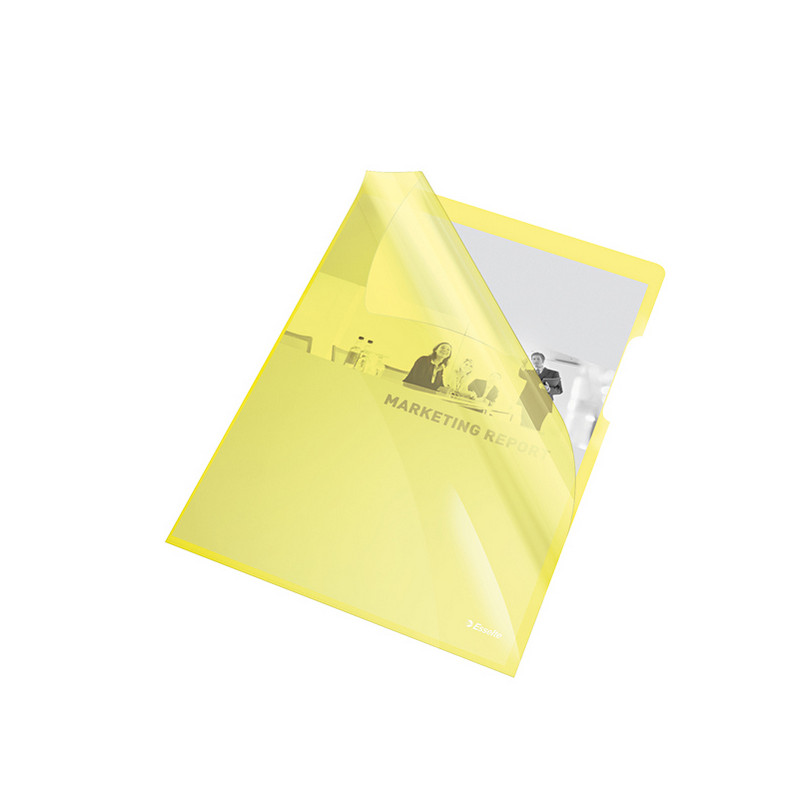 Cartelline a L in PVC extra lucido giallo rigido. Ampia lunetta per facilitare l'apertura. Formato utile: 21x29,7cm. Finitura liscia. Confezione da 25 buste.