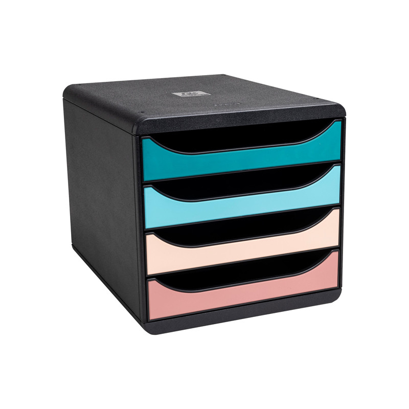 Cassettiera a 4 cassetti per documenti (A4, A4+ o 24x32 cm), struttura monoblocco, resistente e ultrarigida. Realizzata con plastica riciclata proveniente dai rifiuti domestici e quindi certificata Blue Angel. Dimensioni (PxlxAlt) 347x278x267 mm