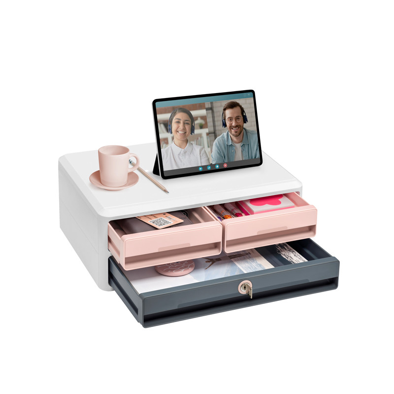 MoovUp, il modulo cassettiera progettato per adattarsi ai nuovi metodi di lavoro. Due cassetti semi-aperti per conservare le forniture per l'ufficio (penne, calcolatrice, blocco A5...) e gli accessori per il computer (hard disk esterno, chiavetta USB, mouse...). Posizionato nella parte superiore per un facile accesso sopra la tastiera. Un ampio cassetto per sistemare documenti, tablet e laptop fino a 14''. Dimensioni cassetto: cassetto semi-aperto 154x245H40mm, cassetto grande 328x245H40mm.Ultrarobusto, può essere utilizzato come supporto per monitor (fino a 5 kg) per favorire una postura corretta. I 3 cassetti si chiudono con una chiave per proteggere documenti confidenziali e oggetti personali, e una porta consente l'installazione di un cavo di sicurezza antifurto (non fornito). Realizzato con il 14% di materiale riciclato post-consumo, completamente riciclabile, in plastica PS di alta qualità. Dimensioni: 370 x 274,5 H 146 mm.