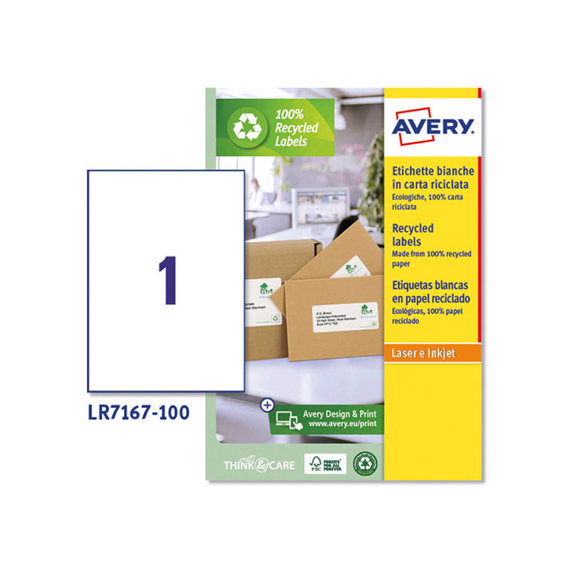 Realizzate in carta riciclata al 100%, sia l’etichetta sia il supporto. Grazie alla finitura JamFREE™ le etichette non si inceppano nella stampante così si evitano sprechi. Adatte per stampanti Laser. Confezione 100 fg.