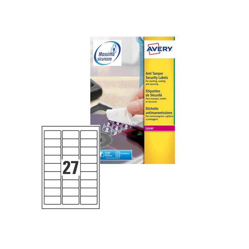 Etichette bianche anti manomissione. Perfette da utilizzare come sigilli di sicurezza per contrassegnare un prodotto originale come autentico. Nel caso in cui si rimuove l'etichette sulla superfi cie appare un motivo a scacchi rendendo evidente la manomissione del prodotto. Confezione da 20fg A4.