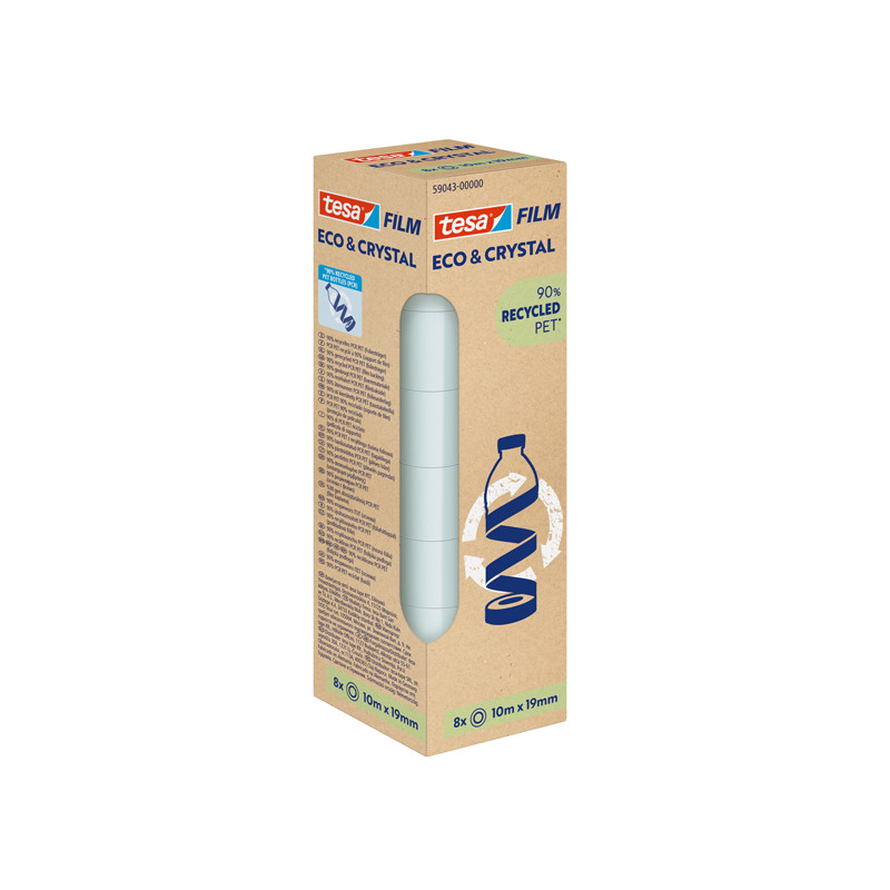 Tesafilm® realizzato da bottiglie in PET riciclate - Nastro trasparente con forte legame. Perfetto per incollare, imballare, fissare, decorare e riparare. Anche il nucleo del rotolo è realizzato al 100% in plastica riciclata.