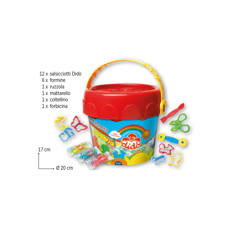 DidòMio Storie di Pasta, più grande e più ricco, con 12 salsicciotti, attrezzi, formine e una tovaglietta gioco permette un approccio alla manualità ricco di forme e stimoli per entrare in un mondo di pasta ed inventare giochi infiniti. Sul coperchio, tanti personaggi pronti per essere stampati ed entrare così a far parte di una storia di fantasia.