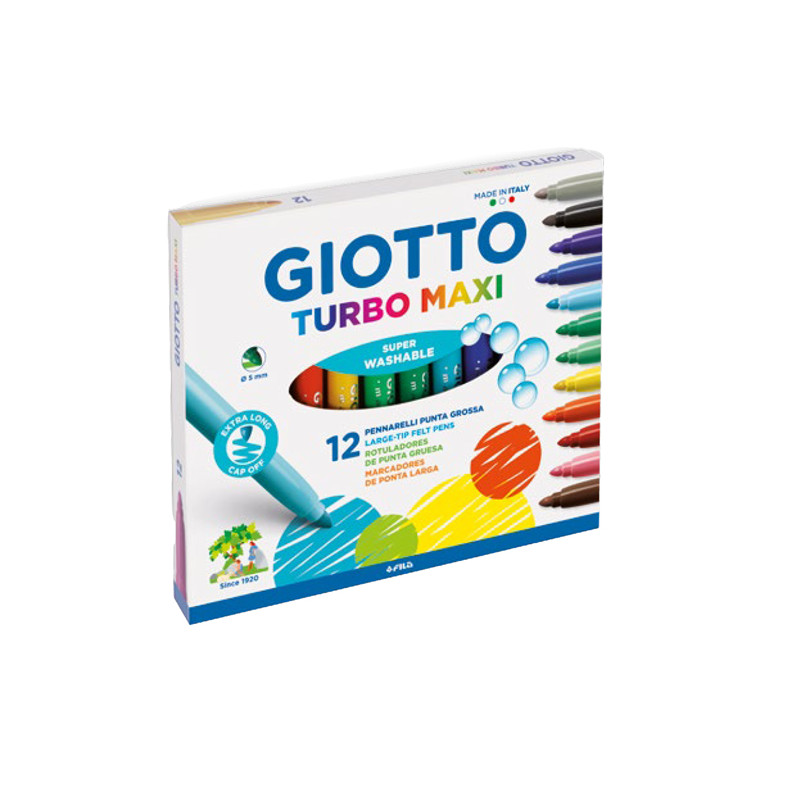 Pennarello formato maxi, facile da impugnare, punta grossa Ø 5 mm. Inchiostri innocui, superlavabili da mani e tessuti in lavatrice a 40°. Cappuccio ventilato e tappo di sicurezza bloccato. Punta antirientro in fibra, super-resistente e di lunga durata. Disponibili confezioni con monocolore. nei olori brillanti ed acquistabili singolarmente nei primi dodici colori.