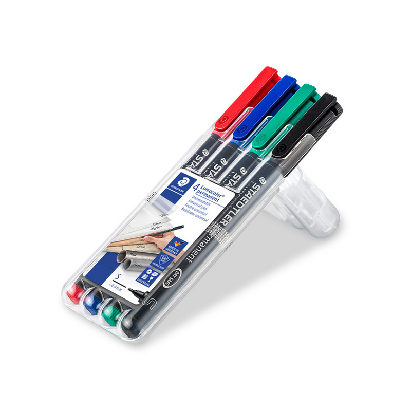 Busta 4 colori. Pennarello con inchiostro permanente a base d’alcool senza toluene e xylene. Quasi inodore. Tratto subito asciutto. Brevettato DrySafe (non secca se lasciato per alcuni giorni senza cappuccio). Ricaricabile con attivatori 487-17.