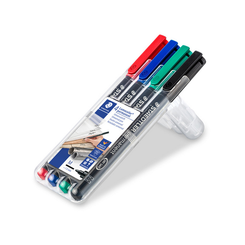 Busta 4 colori. Pennarello con inchiostro permanente a base d’alcool senza toluene e xylene. Quasi inodore. Tratto subito asciutto. Brevettato DrySafe (non secca se lasciato per alcuni giorni senza cappuccio). Ricaricabile con attivatori 487-17.