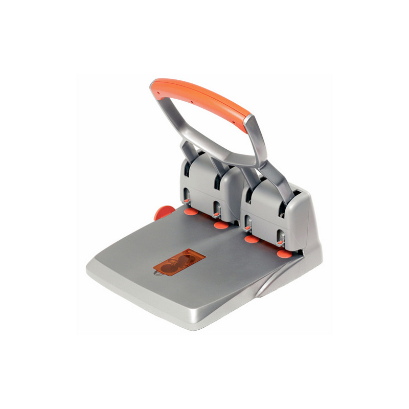 Perforatore HDC150/4 a 4 fori fissi passo 8cm con guida regolabile. Impugnatura ergonomica in gomma antiscivolo e centratura automatica della carta riducono al minimo la forza necessaria per la perforazione. Foro da 5,5mm.