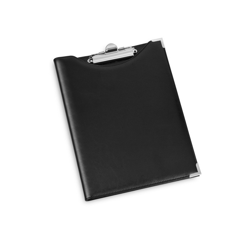 Portablocco in ecopelle 24x31 cm con patella portadocumenti, portapenne, bloccafogli in metallo e paraspigoli in metallo cromato.