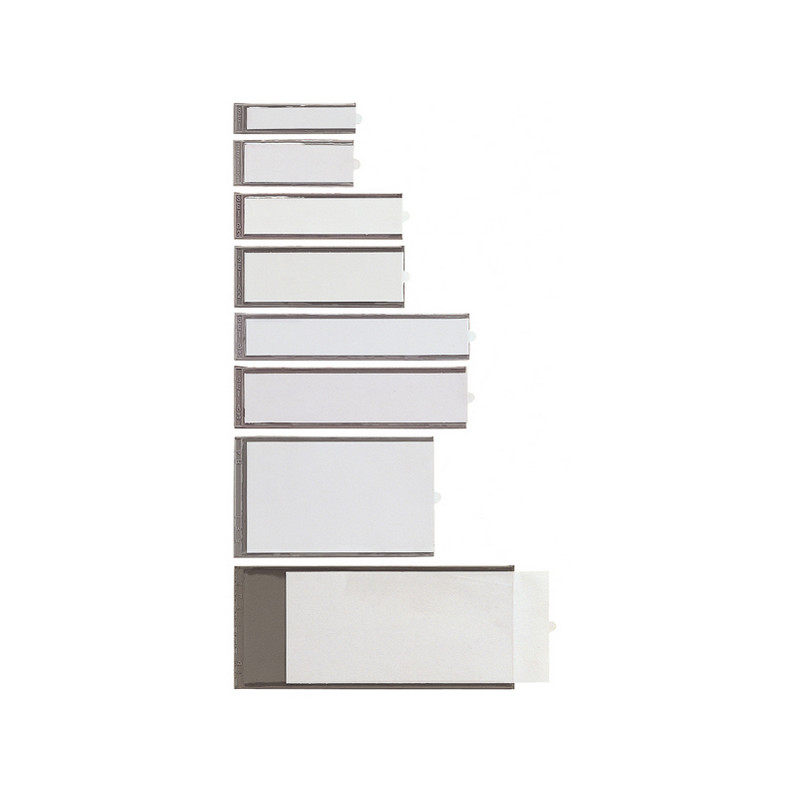 Porta etichette autoadesive in PVC trasparente con fondo grigio ed etichette intercambiabili. Facili da applicare su cassetti, ripiani, scatole, raccoglitori, valige, barattoli e bottiglie. Formato 24x63mm.