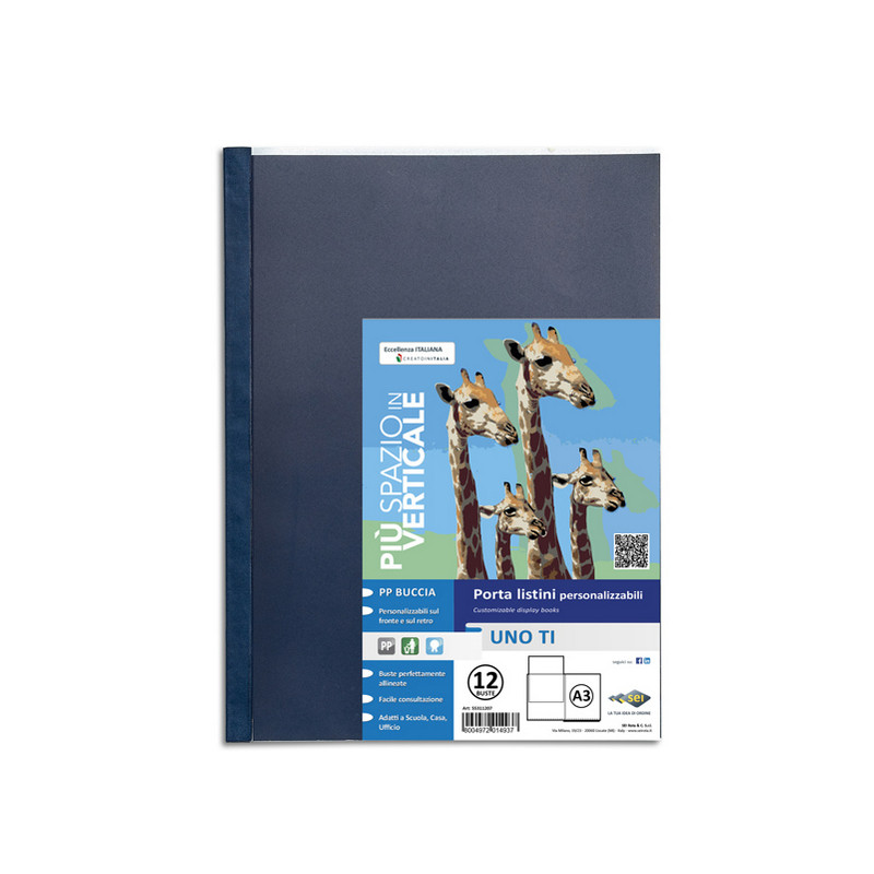 Portalistini personalizzabile da 12 buste in PP buccia, con copertina e retro personalizzabili. Il perfetto allineamento delle buste e la particolare saldatura facilitano la consultazione. Ideali per archiviare disegni, fotografie, stampe, posters, progetti e cartine geografiche. Formato contenuto 30x42cm. Formato A3 libro.
