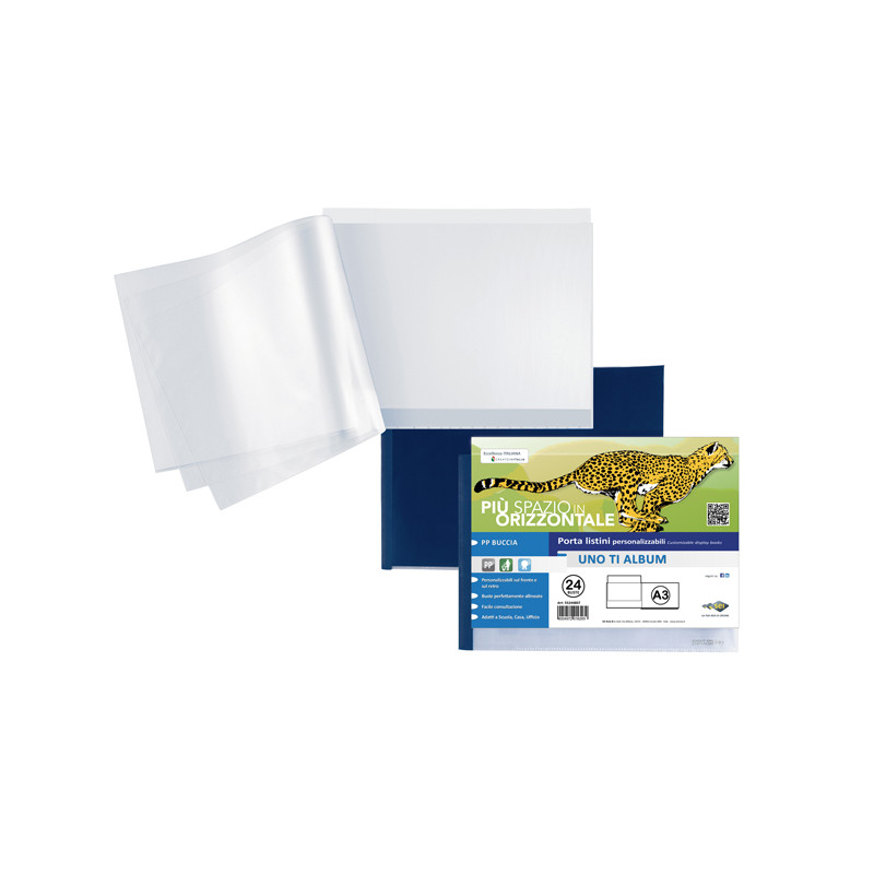 Album porta listini personalizzabile a 48 buste in PP buccia, con copertina e retro personalizzabili. Il perfetto allineamento delle buste e la particolare saldatura facilitano la consultazione. Ideali per statistiche, manuali, disegni, fotografie, progetti. Formato contenuto 420x300mm (A3 album).