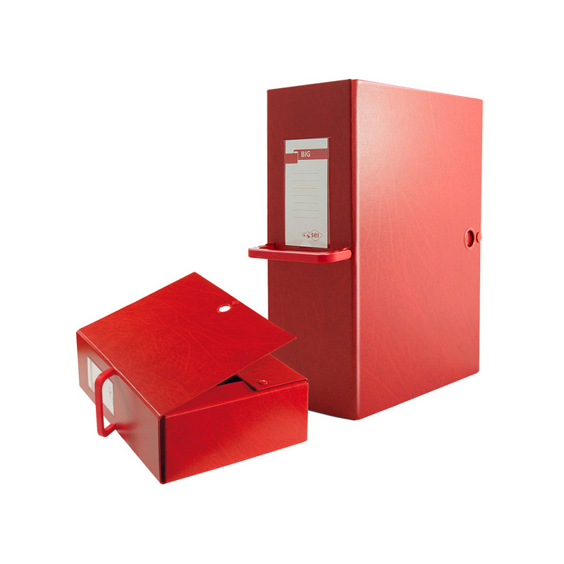 Cartella rossa in Colpan® (cartone rivestito in PVC) chiusura a tre lembi con bottoni automatici. Dotate di porta cartellino con etichetta intercambiabile e di maniglia per poterle spostare agevolmente. I dettagli in tinta evidenziano eleganza e raffinatezza. Ideali per archiviare progetti, disegni, documenti e cartelline. Formato esterno: 260x360mm. Formato contenuto 250x350mm. Dorso 20cm.