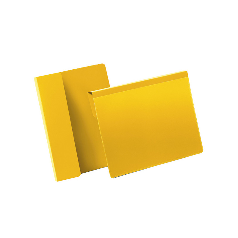 Buste identificative con aletta pieghevole, specificatamente progettate per l'identificazione di pallet e cartonati. Queste buste possono essere inserite tra i cartoni impilati o agganciate ai singoli pallet (la busta rimane appesa all'esterno del pallet o dei cartoni). Robuste e resistenti all'usura e agli strappi, sono realizzate con retro in plastica colore giallo e copertina frontale trasparente in polipropilene. Adatte all'uso con scanner. Facile sostituzione dell'inserto. Proteggono da sporco e polvere i documenti inseriti. È possibile stampare inserti personalizzati utilizzando il software gratuito on-line DURAPRINT® sul sito www.duraprint.it. F.to Utile (LxH) 210x148mm (A5-oriz.). F.to Est. (LxH) 223x259mm. Dorso 22 mm, aletta 54mm.