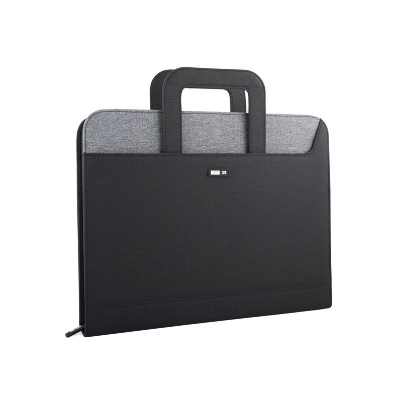 Portablocco in tessuto bicolore. Chiusura con cerniera. Tasca interna con vari scomparti. 4 anelli metallici diam. 3mc. Manici rientranti. Completo di blocco.