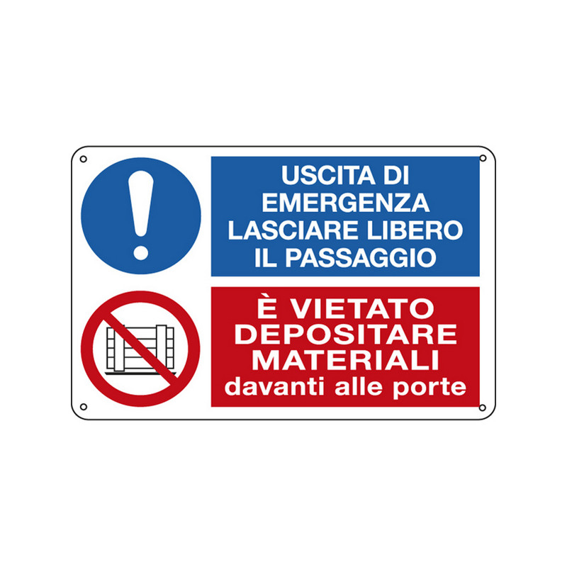 Cartello segnalatore multisimbolo - 30x20 cm - USCITA DI EMERGENZA…/E' VIETATO DEPOSITARE… - alluminio - Cartelli Segnalatori