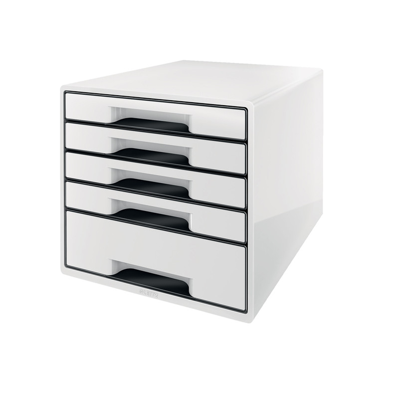 Cassettiera Black & White da 5 cassetti: 4 cassetti poco profondi + 1 cassetto alto per accessori da scrivania, come cucitrice, dispositivi mobili, ecc. Cassettiere impilabili fino a 3 moduli. Ergonomico buco presa nella parte inferiore del cassetti poco profondi per una facile rimozione dei documenti. Dimensioni utili: cassetti bassi L245x H34xP325mm, cassetto alto L245xH71xP325mm. Peso Kg3,59. Piedini in gomma. Dimensioni L287xH270xP363mm.