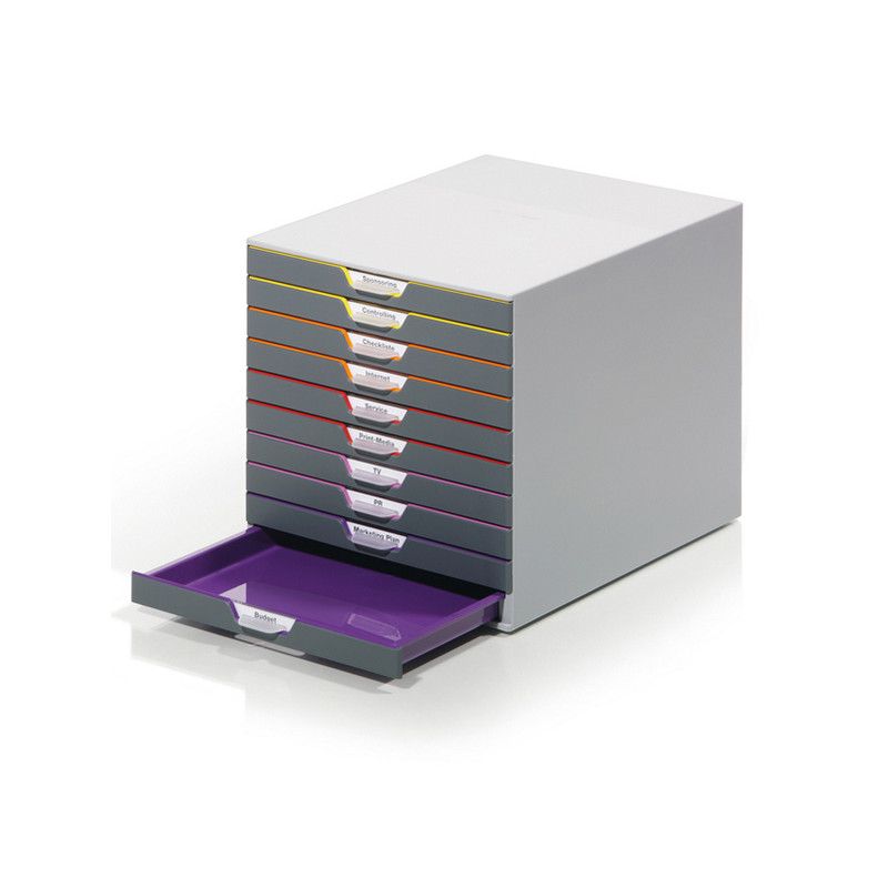 Cassettiere Varicolor a 10 cassetti solida e durevole, realizzata in materiali di alta qualita. Design moderno e ricercato caratterizzato da cassetti con interno e profilo in 5 differenti colori, visibili anche a cassetto chiuso, che facilitano la classifi cazione del contenuto. Ogni cassetto, alto 2,5cm, dotato di fermo fine corsa e portaetichette personalizzabile e removibile. Impilabili e affiancabili. Dimensioni 28x35,6cm - H29,2cm.