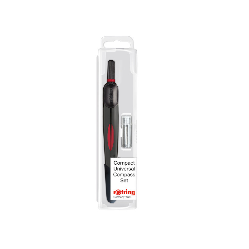 Compasso universale compatto in acciaio inossidabile, regolazione del raggio rapida e semplice e dotato di comoda impugnatura sagomata. Cerchi fino a Ø 320 mm, lunghezza 13cm. Punta intercambiabile 3,5mm. Fornito con astuccio mine.