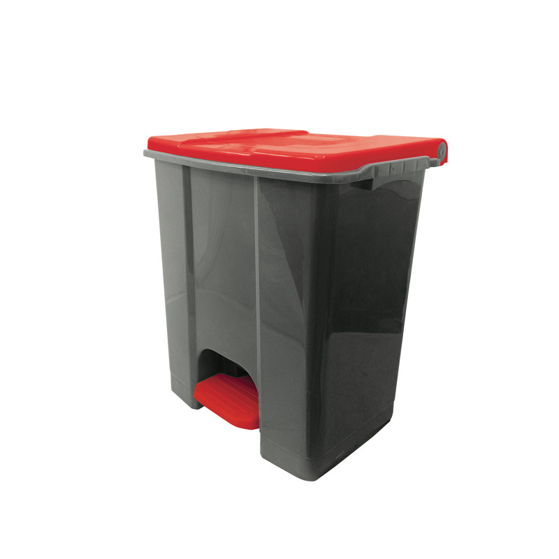 Contenitore in polipropilene plastica riciclata (minimo 70%); sistema d’apertura del coperchio in plastica; ampio pedale nel colore del coperchio per utilizzo conforme al metodo HACCP; maniglia di trasporto posteriore integrata; ruote in plastica per un facile spostamento. Contenitori risultano particolarmente adeguati sia per uso interno che esterno. Dimensioni: 480 × 390 × 550 mm. Capacità: 60lt. La tonalità di grigio del contenitore, essendo realizzato in plastica riciclata, è soggetta a possibili variazioni (grigio scuro o grigio chiaro).