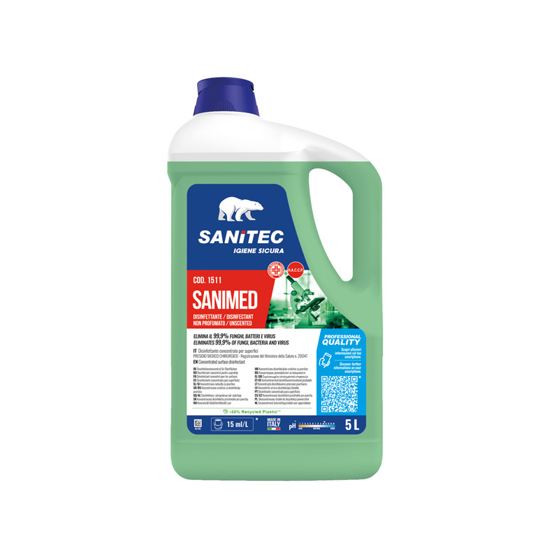 Disinfettante concentrato per uso ambientale, certificato come Presidio Medico Chirurgico. Sanimet esplica un’azione fungicida e battericida, risultando attivo contro i batteri gram-positivi, gram-negativi, funghi e muffe, presenti negli ambienti domestici e professionali. è particolarmente adatto per disinfettare superfici e attrezzature del settore agro-alimentare, alberghiero e della ristorazione. E’ idoneo anche per l’uso in ambienti molto frequentati, quali bagni di locali pubblici, ambulatori e ambienti ospedalieri. Modalità d'uso: Diluire Sanimed in acqua e nebulizzare o stendere con spugna o mop. Per piccoli utensili immergere il materiale da disinfettare. Risciacquare dopo l’uso.