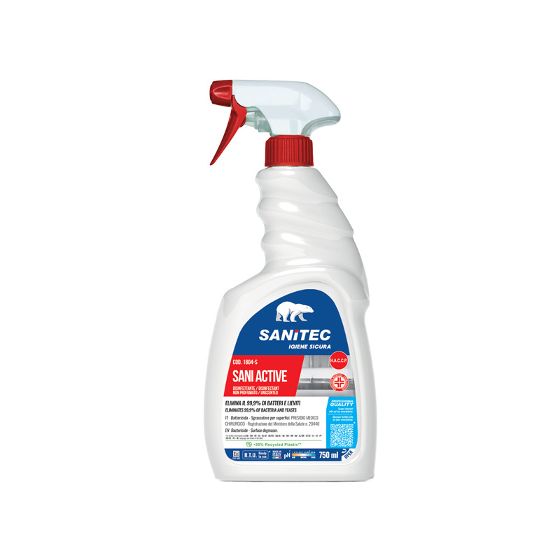 Disinfettante pronto all'uso per superfici. Prodotto Certificato Presidio Medico Chirurgico. Sgrassatore igienizzante Universale. La sua formulazione è studiata per igienizzare e sgrassare a fondo, anche in presenza di sporco ostinato, tutte le superfici. Sgrassa e igienizza tutte le superfici in cucina, bagno, uffici, ambienti pubblici, auto e contenitori di raccolta rifiuti. Consigliato anche per il settore agroalimentare (HACCP) e sanitario, su superfici a contatto alimentare, e per quelle a contatto con persone anziane e bambini. Ideale in tutti casi in cui si necessita di pulizia e igiene in un’unica operazione. Modalità d'uso: Per la normale pulizia spruzzare direttamente sulla superficie da trattare e quindi asciugare con un panno o carta. Per igienizzare spruzzare e lasciare agire per almeno 15 minuti, quindi asciugare con un panno, carta o risciacquare.