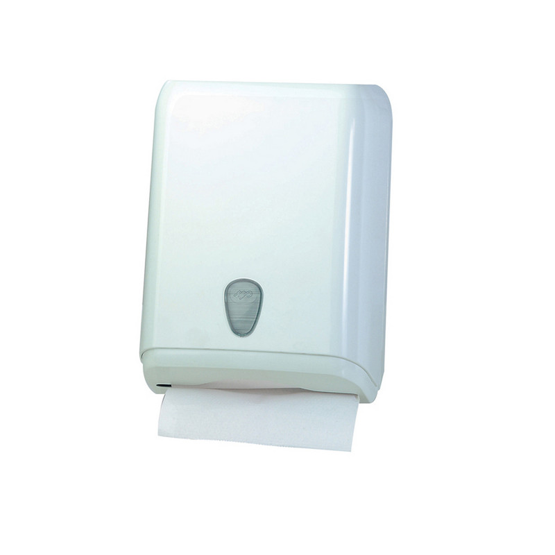 Dispenser portasciugamani piegati a "C" a "Z" a "V". Capacità 400 fogli piegati a Z - 6000 fogli piegati a V. DImensioni: H37,5xP13,7xL28cm. Profondità interna 13cm. Colore: bianco con lente riserva.