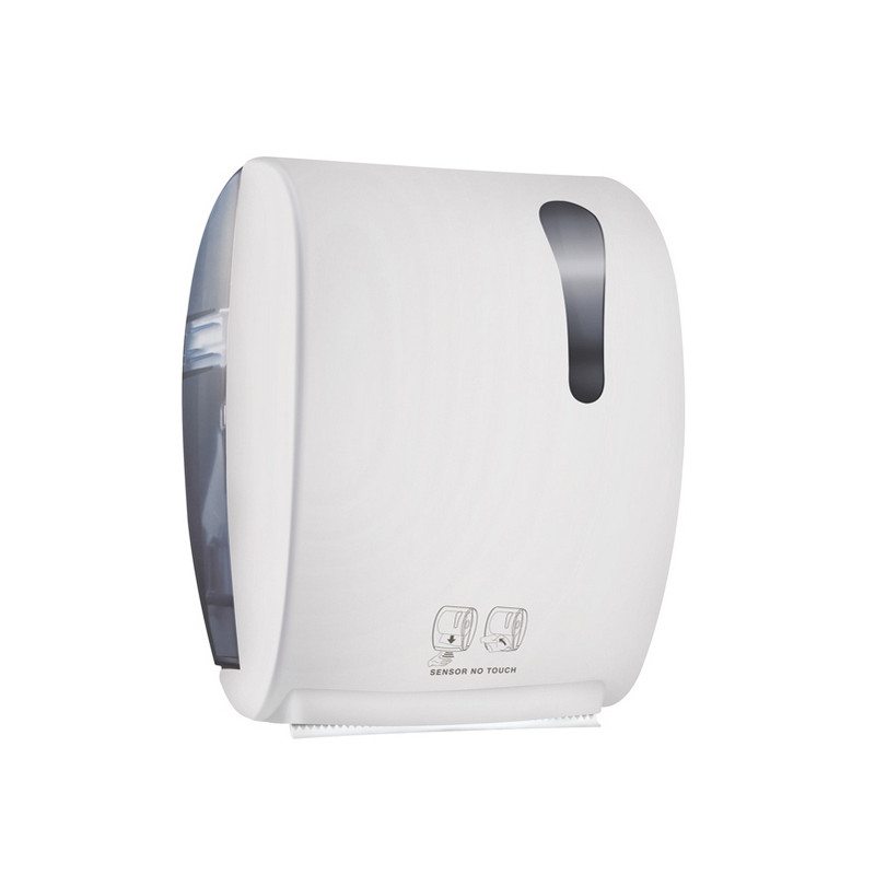 Dispenser in ABS ad erogazione con rilevatore di prossimità e trascinamento elettronico (funziona con 4 pile D). Capacità max bobina asciugamani: H220mm -Ømax 200mm. Meccanismo regolabile: lunghezza di strappo, ritardo tra un'erogazione e l'altra e range del sensore. Come funzione: l'utente, avvicinando le mani al dispenser, attiva il rilevatore di prossimità. Il rilevatore mette in azione il trascinamento elettrico del rotolo (nr. 3 regolazioni di lunghezza da 25, 35 e 45 cm.): L'utente si ritrova un lembo da tirare verso di se, che si taglia con un seghetto nascosto e protetto sotto il coperchio del dispenser.