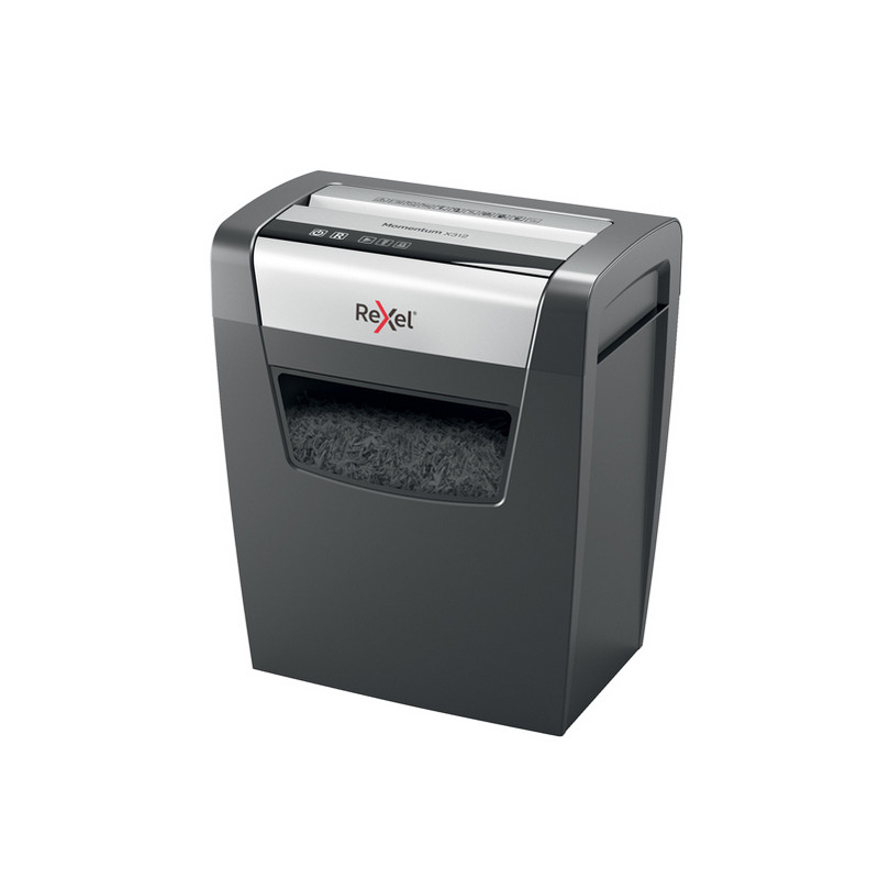 Il potere di distruggere di più! Rexel momentum X312 distrugge fino a 12 fogli per volta. Livello di sicurezza P3 con taglio a frammenti da 5x42 mm. Silenzioso, con pulsanti di controllo a sfioramento semplici e intuitivi per un facile utilizzo e una generosa capacità del cestino da 23 litri.