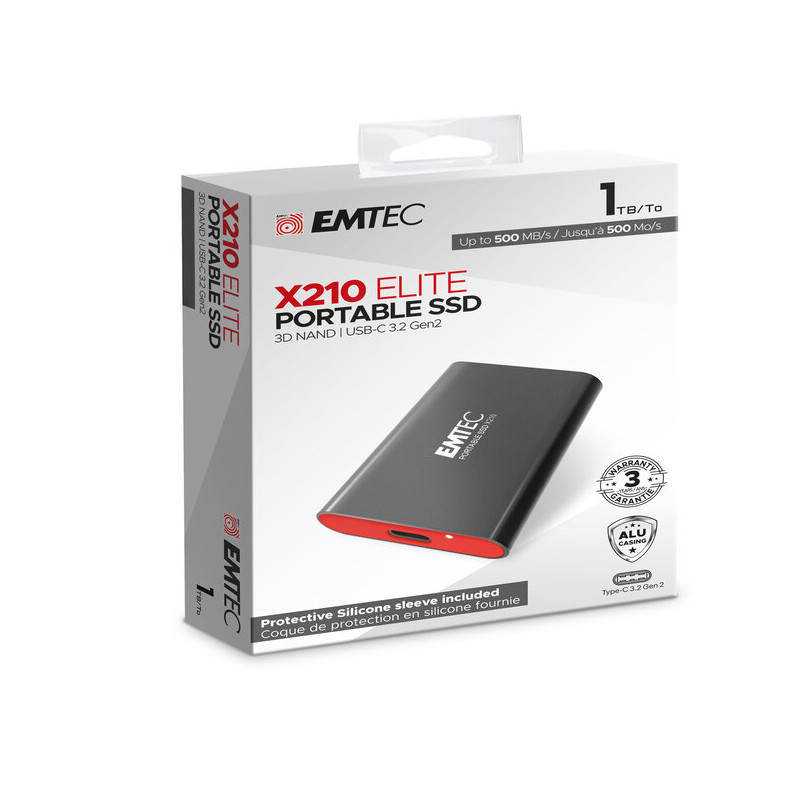 X210 ELITE Portabile SSD L'SSD portatile X210 offre velocità di trasferimento elevate e una soluzione di archiviazione nomade. Questo lo rende ideale per salvare e trasferire tutti i tuoi file: ufficio, musica, foto ad alta risoluzione e video Interfaccia USB-C 3.2 Gen2 (10 Gbps) Compatibile all'indietro con USB 3.2 Gen1, e USB 2.0 Cavo da USB-C 3.2 Gen2 a USB-A incluso Goditi la tecnologia flash 3D NAND tranquilla Compatibile con Mac e Windows, smart TV e le ultime console di gioco Resistente agli urti e alle vibrazioni e dal design compatto Elegante involucro in alluminio. Custodia protettiva in silicone inclusa a partire dalla capacità di 512GB. Dimensioni ultra compatte (70x40x11mm) e peso leggero (30g).