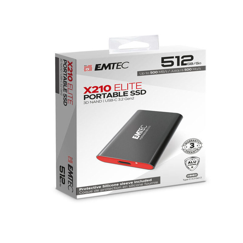 X210 ELITE Portabile SSD L'SSD portatile X210 offre velocità di trasferimento elevate e una soluzione di archiviazione nomade. Questo lo rende ideale per salvare e trasferire tutti i tuoi file: ufficio, musica, foto ad alta risoluzione e video, Interfaccia USB-C 3.2 Gen2 (10 Gbps) Compatibile all'indietro con USB 3.2 Gen1, e USB 2.0 Cavo da USB-C 3.2 Gen2 a USB-A incluso Goditi la tecnologia flash 3D NAND tranquilla Compatibile con Mac e Windows, smart TV e le ultime console di gioco Resistente agli urti e alle vibrazioni e dal design compatto Elegante involucro in alluminio. Custodia protettiva in silicone inclusa a partire dalla capacità di 512GB. Dimensioni ultra compatte (70x40x11mm) e peso leggero (30g).