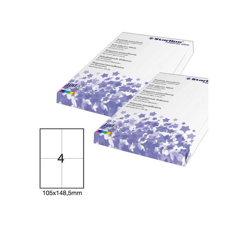 Etichette adesive bianche STARLINE utilizzabili con stampanti laser, inkjet o fotocopiatori. Adesivo permanente. Prive di margne di sicurezza lungo il perimetro. In scatola da 100 fogli formato A4.