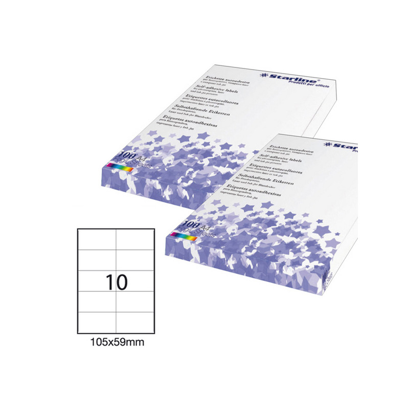Etichette adesive bianche STARLINE utilizzabili con stampanti laser, inkjet o fotocopiatori. Adesivo permanente. Prive di margne di sicurezza lungo il perimetro. In scatola da 100 fogli formato A4.
