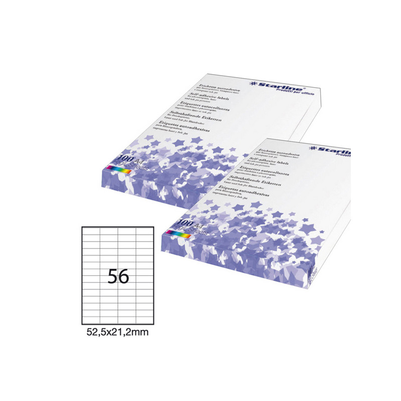 Etichette adesive bianche STARLINE utilizzabili con stampanti laser, inkjet o fotocopiatori. Adesivo permanente. Prive di margne di sicurezza lungo il perimetro. In scatola da 100 fogli formato A4.