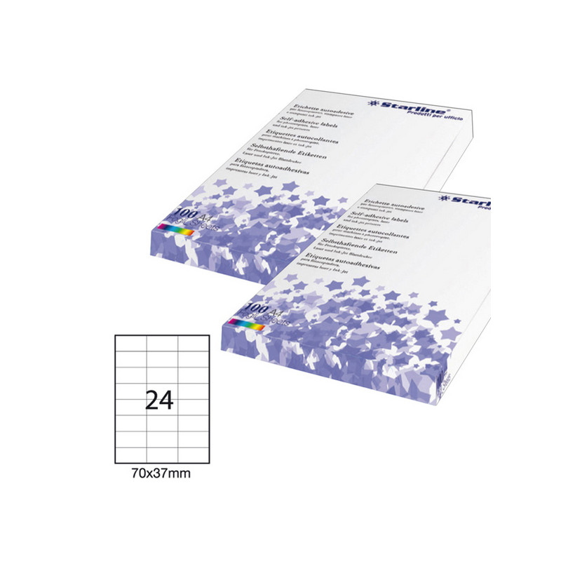 Etichette adesive bianche STARLINE utilizzabili con stampanti laser, inkjet o fotocopiatori. Adesivo permanente. Prive di margne di sicurezza lungo il perimetro. In scatola da 100 fogli formato A4.