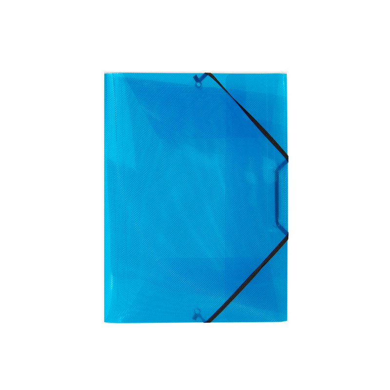Cartelle realizzate in polipropilene blu trasparente con speciale finitura rigata. Chiusura con elastico piatto di colore nero. Formato utile: 22x30cm. Dorso 0-3cm. Made in China.